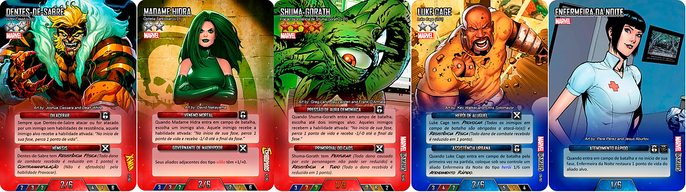 Cartas de apoio ou Substitutos: - Wolverine (v.03), se o oponente tiver muitos personagens com resistência. - Homem-Gorila, se observar que a Build inimiga e formada por muitos Heróis - Tempestade (v0.1), efeitos de veneno são habilidades ativadas pelo adversário - Andarilho dos Céus